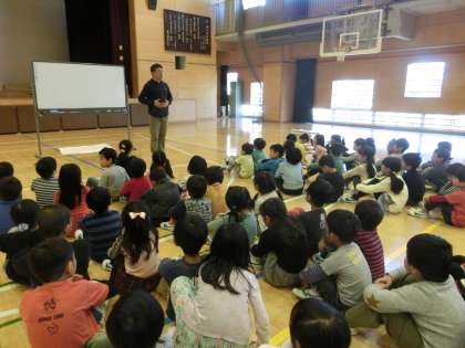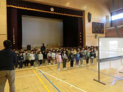 金曜日は、桜小のお兄さんお姉さんが待つ体育館へ、入場して1年生が呼びかけや歌を歌う対面式があります。