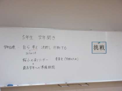 高学年の仲間入りをした5年生。学年集会を開いて、専科の先生方からの話や学年目標を確かめました。