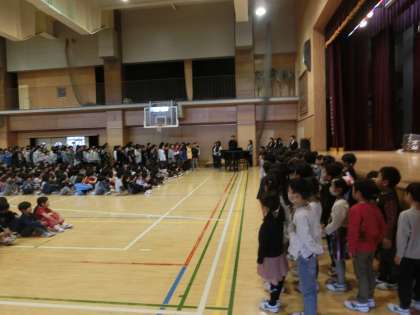 2年生から6年生が待つ体育館に、1年生は入場して、呼びかけの言葉と、「さんぽ」を元気よく歌いました。