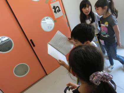 2年生の児童に学校を案内をされて、プールや理科室、音楽室などをめぐり、説明を聞きました。