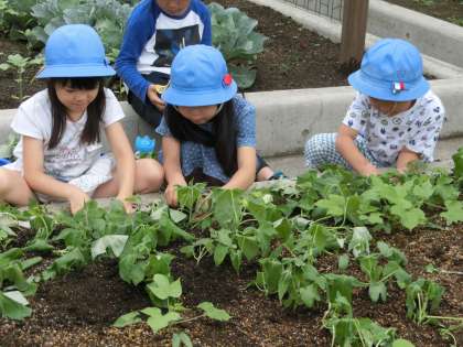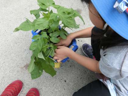 アサガオを抜くことに戸惑いつつ、間引いたアサガオを学年園へ植え直しました。