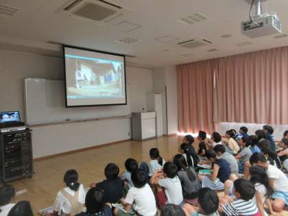 真剣な眼差しで話に聞き入り、メモをとる5年生。苦しい生活を強いられている人たちの映像を見ながら、様々な思いがこみ上げてきた様子でした。