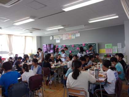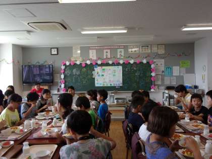 遊びのあとは、交流給食です。黒板いっぱいに歓迎の気持ちを表し、楽しくおいしくいただきました。
