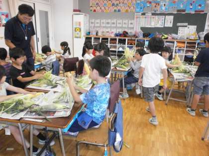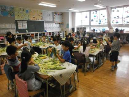 木曜日に1年生がとうもろこしの皮むきをしてくれました。みんなが一生懸命剥いてくれたとうもろこしは、甘くてとってもおいしかったです。