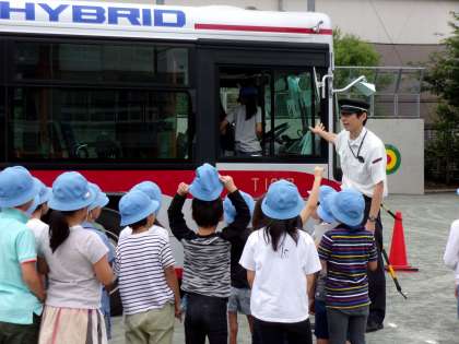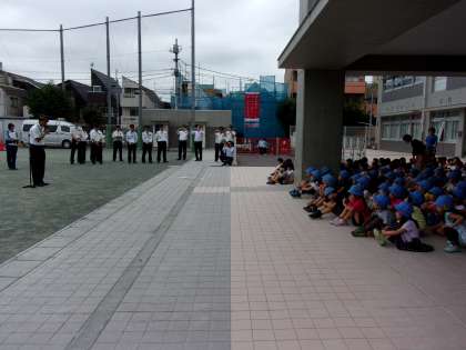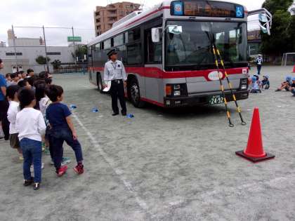 1,2年生で交通安全教室が行われました。バスの死角や、巻き込みなどを知るための教室です。バスが2台、バス会社のスタッフの方が10名ほど、警察の方が5名も来ていただきました。真剣に学習をすることができました。