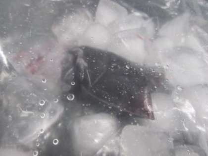 小さい袋にジュースを入れ、それを氷と一緒にビニール袋に入れました。