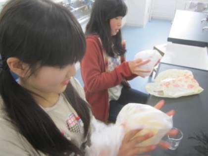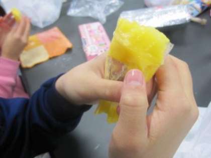 氷に塩を振り、根気強く手でもんでいると・・・アイスキャンディーの出来上がりです!