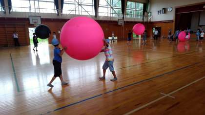 キンボール体験では、大きなボールを持ってリレーをしたり、二人一組で相手のボールを落としたり、様々なゲームをしました。