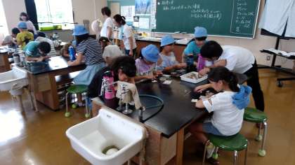 理科教室では、柏崎海岸に漂着した貝の中から微小貝を探して顕微鏡で観察しました。1ミリ程の小さな貝を必死に探して、その可愛らしさに目を輝かせていました。