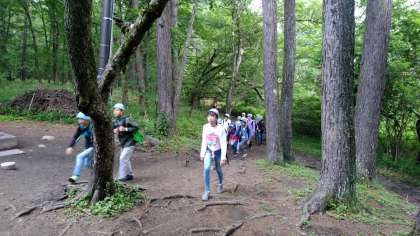 14:15、赤沼に到着。途中、何度か小雨が降りましたが、ひどくなることはなく現在はあがっています。子供たちは、「疲れた〜。」と言いながらも頑張って歩いています。