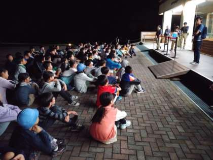 18:45、ナイトハイクの時間になりました。クラスごとにガイドさんが付いて、宿舎近くを散策します。東京と違って真っ暗な夜道を歩いたり、川場村の動物たちの話を聞いたりしました。後半は雲が切れて星空も見ることができ、子供たちは大喜びの様子でした。
