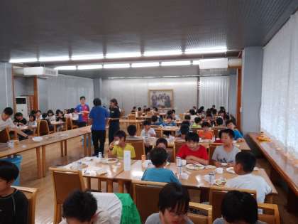 ふじやまビレッジでの最後の食事です。係の子供たちも慣れて、てきぱき準備できるようになりました。今朝はパンなので、喜んでいる子がたくさんいました。