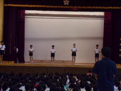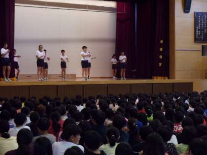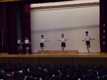 今日は縄跳び集会です。体育委員会の人たちがお手本を見せてくれました。
