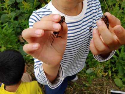 稲刈り中に、虫を見つけて大興奮の子もいました。コオロギやイナゴがたくさんいます。