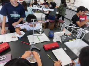 実験用てこを使い、左のうでと右のうでがつり合うきまりについて調べました。