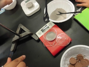 おもりの重さを調べたり、つり合うように砂を使っておもりを作ったりしながら、