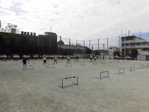 連合運動会でハードル走に挑戦する児童もいます。