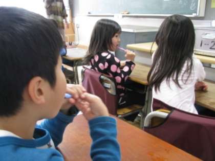 給食の後は、しっかり歯をみがきます。(1年生のようす)