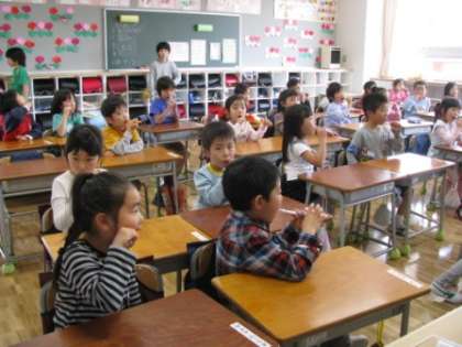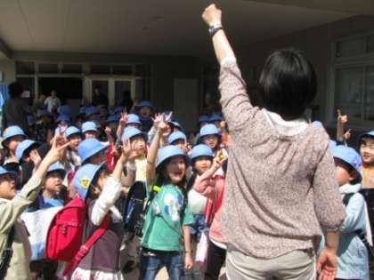 写真(上)----音楽に合わせて、正しいはみがきのしかたを覚えます。