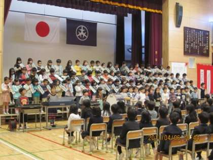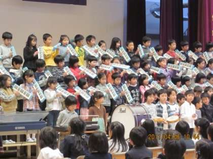 「雨にもまけず」の群読、「あの青い空のように」の合奏を