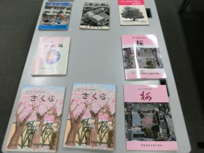 それをお祝いして、桜小学校に昔から伝わる写真やパネルなどの資料を、今週の金曜日までパソコン室に展示してあります。校歌の作詞に関わってくださった北原白秋さんという、とっても有名な方が書いた校歌など、「お宝」ばかりです。見たい人は、担任の先生と一緒に行くか、中休みにパソコン室へ見に来てください。放課後に、お家の方と一緒に来てもいいですよ。
