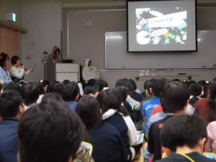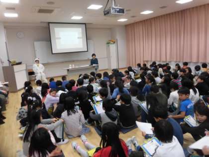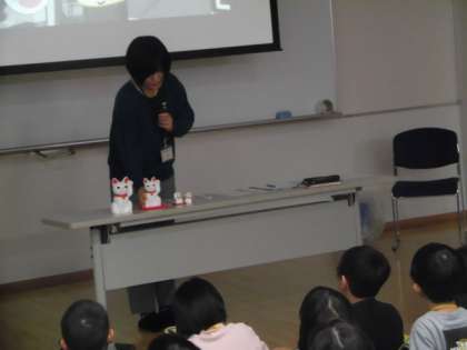 子供たちは、スライドやまねきねこの実物に興味津々!