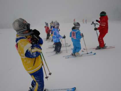 午前中は、雪と風の中の寒いレッスンとなりました。夜間の降雪でゲレンデの状態が良くなったので、昨日よりもかなり滑れる子が増えています。