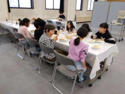 昼食は、スキー班ごとに食べました。カレーライスでエネルギーを補給して、午後の検定に備えます。