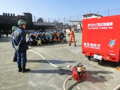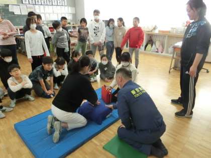 1年生は、煙中体験という火事の煙で辺りが何も見えなくなった部屋を歩く体験をしました。2年生は、「まちかど防災車」で本物のホースを自分で持って消火しました。3年生は起震車で震度7の激しい揺れを体験し、4年生はプールサイドで消火器を使う訓練、5年生はAEDという機械を使って心臓の動きが止まった人を助ける訓練、6年生は自分たちで避難所を設営する訓練をしました。