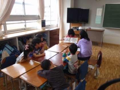 6年生のお兄さん・お姉さんがおもしろい本を選んで、読み聞かせをしてくださいました。初めての本にじっと聞き入っていました。内容を知っている本でも、お話に夢中になりました。