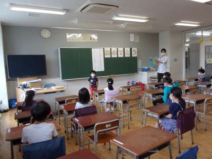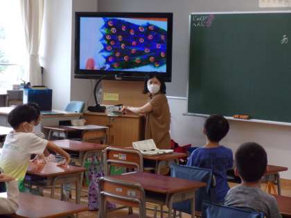 8時45分から授業が始まります。最初は緊張しているので、1組は動物クイズ、2組は自己紹介クイズで盛り上がっていました。どのクラスからも歓声が上がり、楽しそうです。