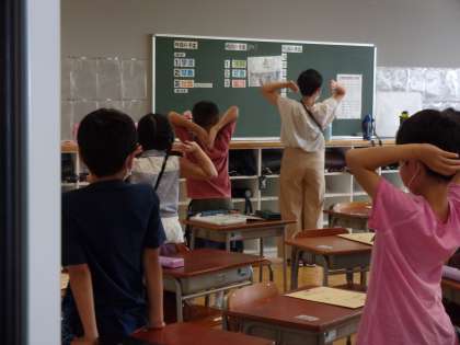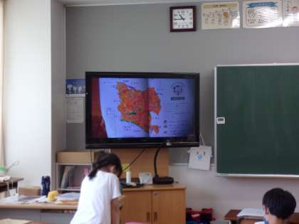 3年生は、社会科の学習です。「私たちの世田谷」本が固くて、見開きにするのが大変だったようです。課題の中で難しかった「東西南北」を手を使って確かめています。身体を動かして確かめるのも大切な学習です。