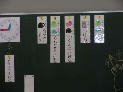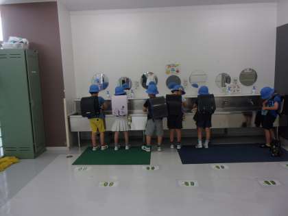 暑い中でしたが元気に登校しました。手を洗うのも2回目でスムーズです。黒板に貼ってある絵のリストを見て準備をします。こちらはまだ慣れないようですが、徐々に慣れてくると思います。