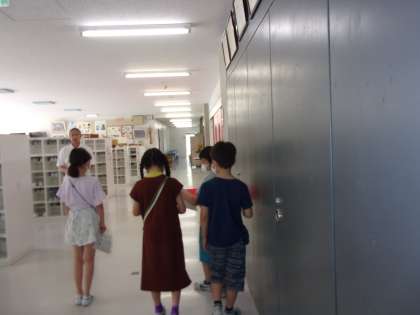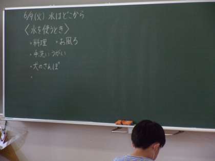 再び「水のゆくえ」の学習です。各グループごとに、学校を回って水道の場所を探ります。「ちょっと少ないかな。」「体育館の周りは多かったよ。」など、いろいろな感想が。みんなで学習できるのはやっぱり学校です。