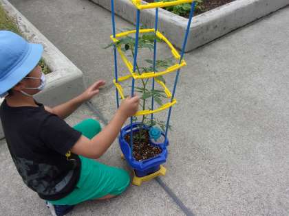 「育ってる〜。」と嬉しそう。わき芽と葉の区別が難しいようで、