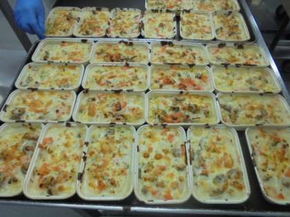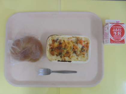 ☆今日はポテトグラタンが出ました。具たくさんのホワイトソースとじゃがいもを調理員さんが一つずつグラタン皿に詰めて、焼きました。子どもたちもおいしそうに食べていました。