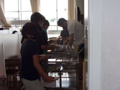 今日から給食は、「おかわり」ができます。みんな、「イエーイ」と大喜び。ちゃんとマスクをつけて並んで、担任によそってもらいます。