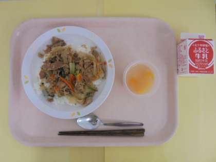 ☆今日は「豚丼」が出ました。35kgもの豚肉を使って作りました。豚肉には疲れをふきとばす栄養がたくさん含まれています。豚丼をしっかり食べて、今週も元気に過ごしてほしいです。
