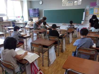 今日から夏休みとなりました。今日から午前中は「補習授業」と「図書の本の貸し出し」、午後は「個人面談」です。午前の補習授業と図書の貸し出しの様子です。結構たくさんの児童が来て図書室を利用しました。新しい夏休みの様式です。