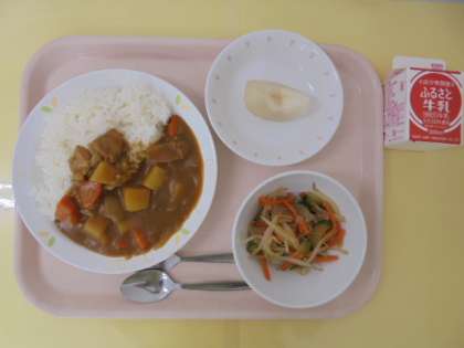 チキンカレーライス 牛乳 こんにゃくサラダ くだもの(梨)