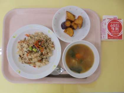 五目ごはん 牛乳 とうふのみそ汁 大学いも