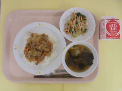 ☆今日は「豚丼」が出ました。豚肉には疲れをとるビタミンBが多く含まれています。今日も暑かったので、しっかり食べて残りの2日間も元気に過ごしてほしいです。