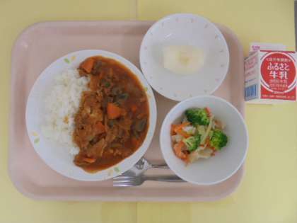 ハヤシライス 牛乳 ブロッコリーサラダ 梨
