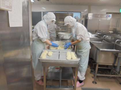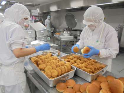 写真は、コロッケバーガーを作っている様子です。手作りのコロッケを一つ一つパンに挟みました。