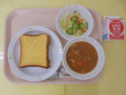 ☆今日は「フレンチトースト」が出ました。卵と牛乳で作ったカスタード液を一枚一枚食パンに浸し、焼き上げました。食パンの耳もやわらかくなるように焼いたので、子どもたちも食パンの耳までしっかり食べてくれました。