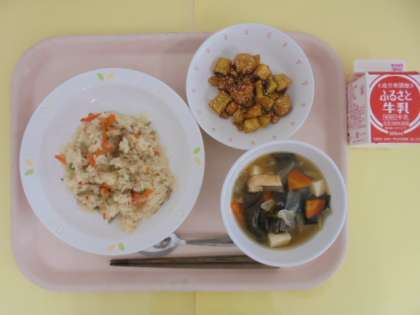 豚肉とごぼうのごはん 牛乳 豆腐のみそ汁 いかとさつまいもの揚げ煮