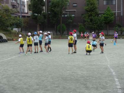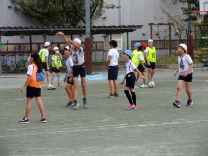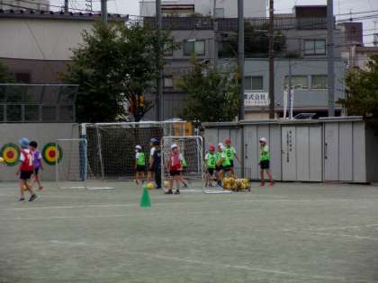 校庭で活動しているクラブです。みんな楽しそうです。(笑顔がお届けできず残念です・・)室外ゲームクラブ、サッカークラブ、バスケットボールクラブです。