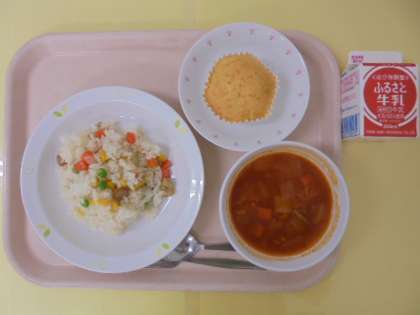 三色ピラフ 牛乳 ミネストローネ ぐりとぐらのカステラ