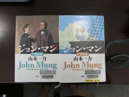 校長先生が今、読んでいるのは、「ジョン万次郎」という人のお話です。万次郎は、江戸時代の終わりごろ、14歳で船に乗って魚を獲っているときに台風に巻き込まれ、無人島へ流れ着きます。水も食べ物も無く、死を覚悟したときにアメリカの船に助けられて、万次郎は必死に英語を覚え、一生懸命に勉強をしてアメリカの学校を1番の成績で卒業します。その後、万次郎はどうしても日本へ帰って大好きなお母さんに一目会いたい、と努力を重ねます。果たして、万次郎は日本へ帰ることができたのでしょうか。続きが知りたい人は、図書館にも何冊か本がありますので、ぜひ読んでください。