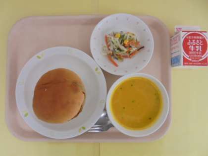 ☆今日は「パンプキンポタージュ」が出ました。かぼちゃを鶏ガラだしでゆで、なめらかに漉して、焦げないようにじっくりと調理員さんが作ってくださいました。子どもたちも鮮やかなオレンジ色のパンプキンポタージュをたくさん食べてくれました。